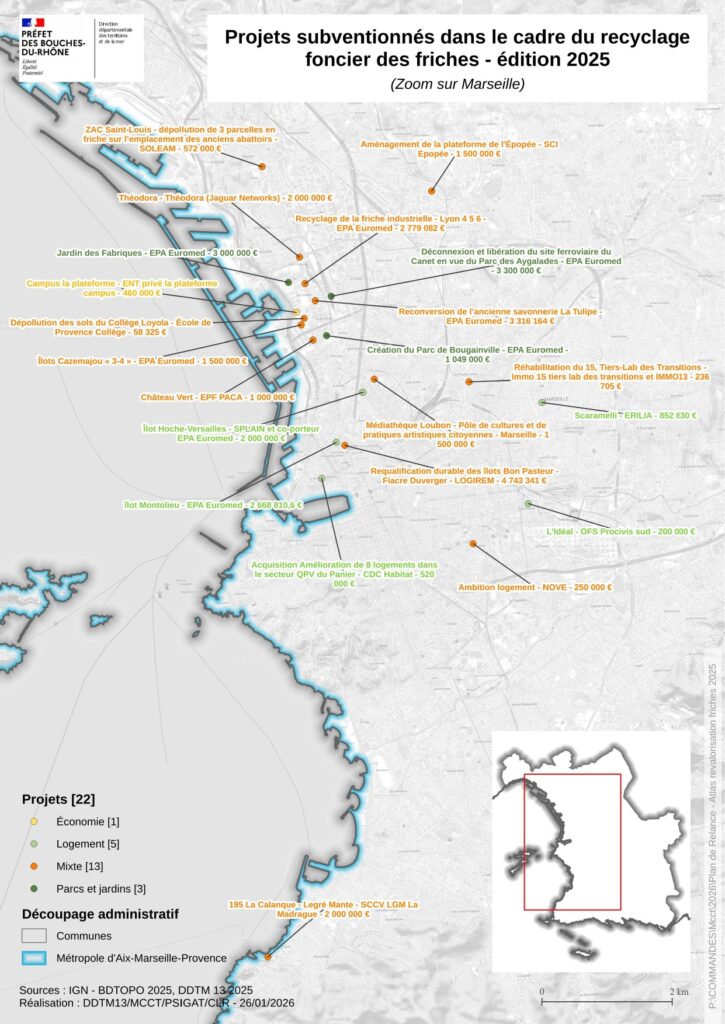 « La transition écologique de nos territoires doit aujourd’hui constituer le fil conducteur de l’action collective. » Des paroles aux actes, le préfet de région Provence-Alpes-Côte d’Azur et des Bouches-du-Rhône, Jacques Witkowski, a publié, jeudi 12 février, un atlas recensant les projets de recyclage foncier de friches accompagnés par l’État dans le département depuis 2021.