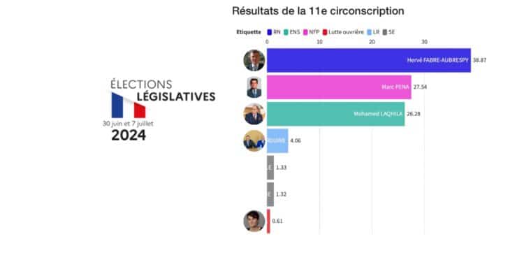 Le député sortant de la 11e circonscription Mohamed Laqhila n’arrive qu’en 3e position avec 26,28% des voix, devancé par le socialiste Parc Pena (NFP) et Hervé Fabre-Aubrespy (RN) qui obtient 38,87% des voix.