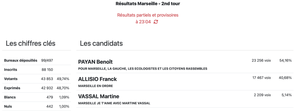 Le maire de Marseille Benoît Payan que les premières estimations donnaient largement gagnant au second tour confirme selon les premiers résultats issus du dépouillement des bureaux de vote. Peu après 23h, le candidat DVG pointait à 54,16%