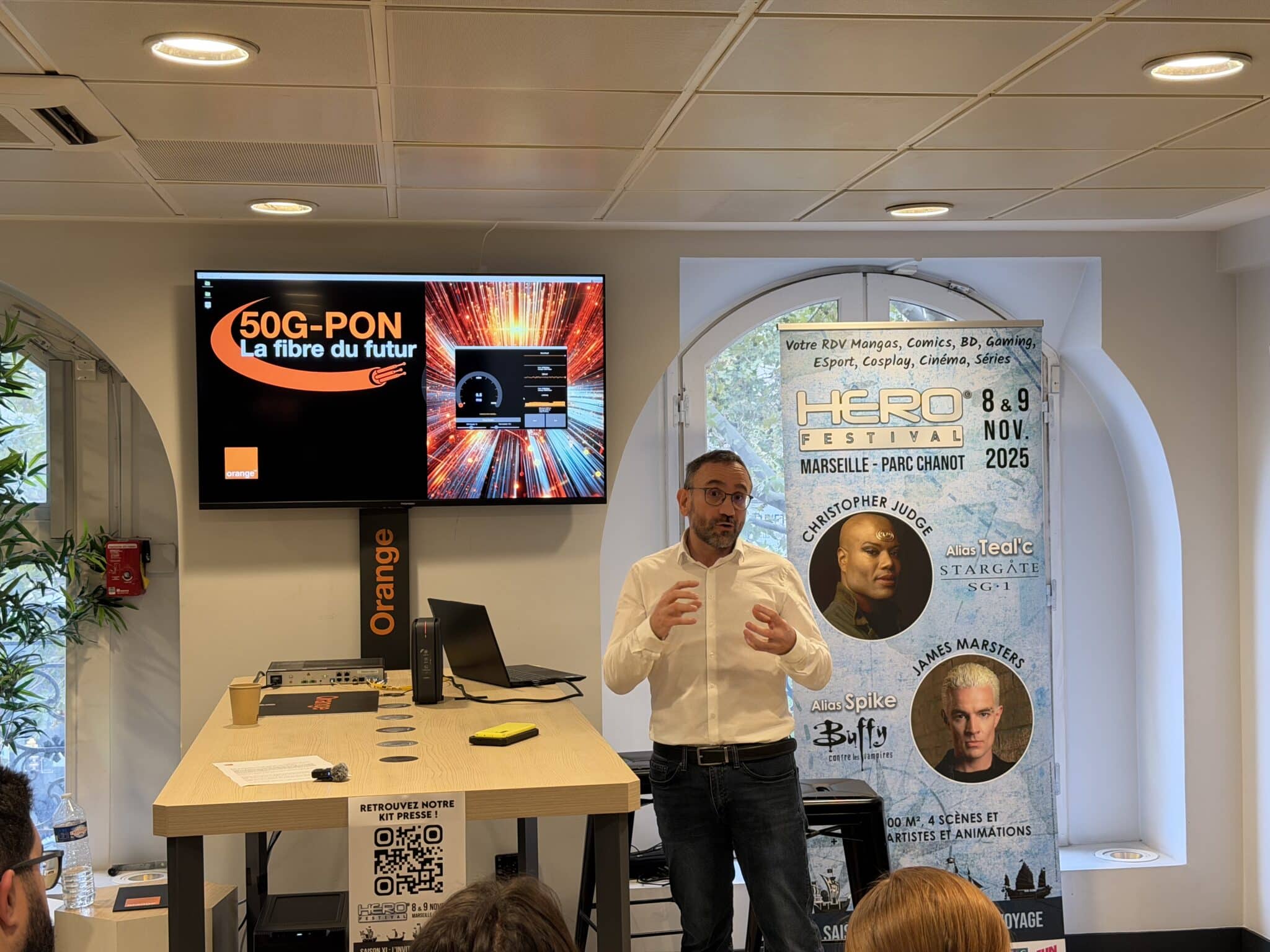 « Préparer la fibre de demain, c’est important », ouvre Vincent Parisot, directeur de la communication et de la RSE d’Orange dans le grand sud-est. Et c’est dans sa boutique de la Canebière, à Marseille, qu’Orange a présenté, jeudi 23 octobre, la « fibre du futur », une technologie capable d’atteindre des vitesses inédites grâce au 50G-PON. Il s’agit d’une première démonstration publique en conditions réelles, organisée simultanément à Lyon et Marseille. Derrière cette innovation, l’opérateur veut prouver sa capacité à anticiper les besoins des foyers et des entreprises, toujours plus gourmands en bande passante.