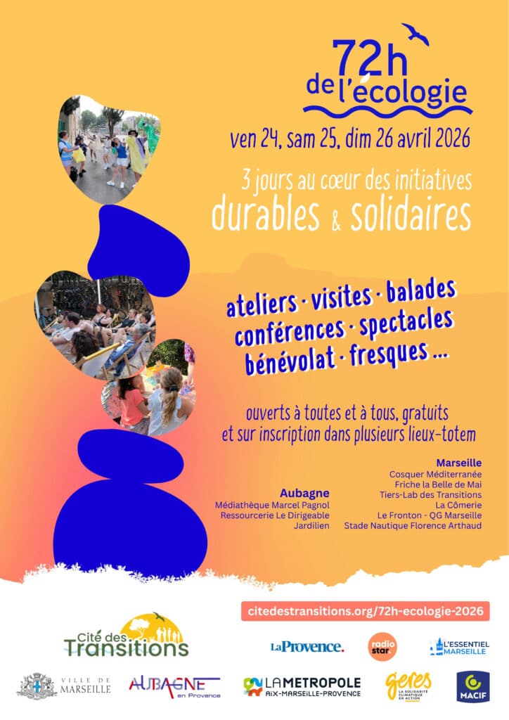 Conférences, ateliers, visites : les « 72h de l’écologie » se déploient du 24 au 26 avril entre Marseille et Aubagne. Porté par la Cité des Transitions, l’événement rassemble les acteurs associatifs, entreprises et collectifs engagés.