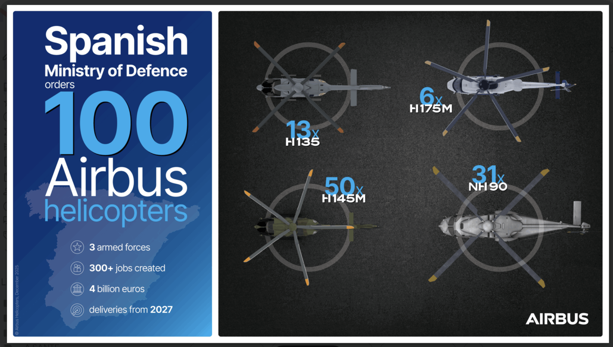 C’est un nouveau très cadeau Noël pour le groupe Airbus Helicopters basé à Marignane. Après l’Allemagne, la Belgique ou l’Irlande, c’est un autre pays européen qui signe avec l’industriel. Et l’Espagne ne s’engage pas à la légère avec une méga commande de 100 hélicoptères par l’intermédiaire de la Direction générale de l’armement et du matériel…