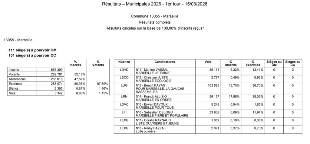 Le 1er tour des élections municipales à Marseille livré son verdict à l’aube de ce lundi 16 mars. Les résultats officialisés à 5h du matin sont une onde de choc pour la vie politique locale. Si Benoît Payan, le maire sortant DVG, parvient finalement à prendre la tête du scrutin avec 36,70% des suffrages exprimés, il ne devance le candidat RN Franck Allisio (35,02%) que d’une courte tête avec 4500 voix d’avance.