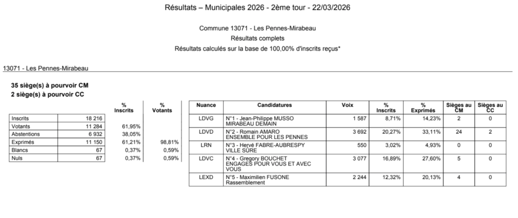 Avec 33,11 % des suffrages, soit 3 692 voix, la liste « Ensemble pour Les Pennes-Mirabeau » conduite par Romain Amaro arrive en tête et décroche la majorité municipale. Dans un contexte de forte dispersion des voix, cette performance lui permet de s’imposer sans majorité absolue, mais avec une avance suffisante pour gouverner.