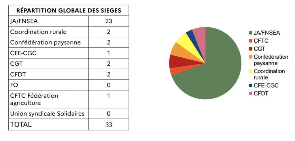Si au niveau national, les résultats sont marqués par une forte poussée de syndicats contestataires comme la Coordination rurale (14 départements en jaune) et la Confédération paysanne (cas unique en Ardèche), avec le gain au total d’une quinzaine de chambres, le scrutin dans les Bouches-du-Rhône et la Région est plus favorable au syndicat majoritaire FNSEA-JA (Fédération nationale des syndicats d’exploitants agricoles et Jeunes Agriculteurs)