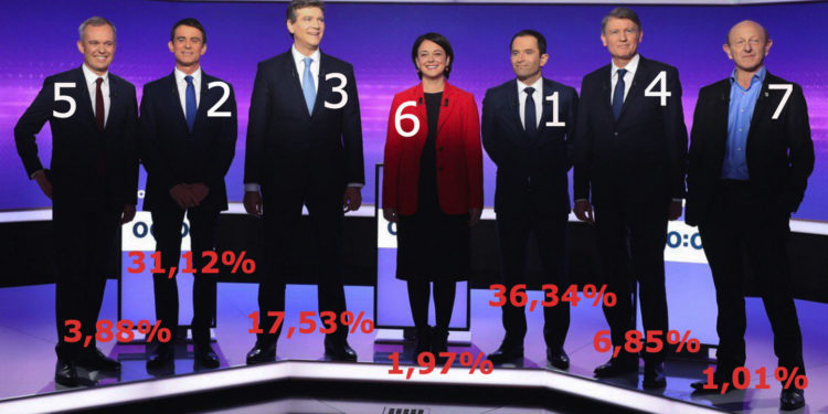 Selon des résultats encore partiels, basés sur les bureaux de vote entièrement dépouillés, Benoît Hamon arrive en tête avec 36,12% , devant Manuel Valls situé à 31,24%. Arnaud Montebourg est en troisième position avec 17,79%.