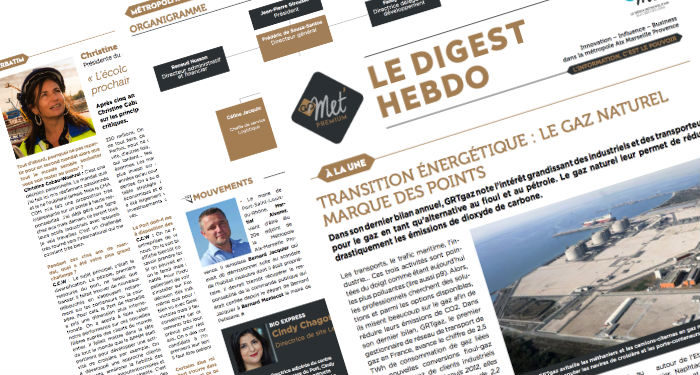 Dans le Digest Hebdo n°93 cette semaine, Gomet’ a consacré sa Une au gaz naturel, une énergie de plus en plus plébiscitée par les entreprises de la région pour réduire leur bilan carbone. Le gestionnaire du réseau GRTgaz relève un intérêt grandissant des industriels et des transports publics. En « off », l’annonce officielle du successeur de Roger Meï à la mairie de Gardanne se profile…