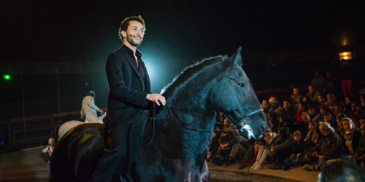 La nouvelle production de la compagnie et théâtre du Centaure est entrée cette semaine dans la Biennale internationale des arts du cirque. Sur scène deux étalons l’un noir et l’autre blanc, font corps avec deux comédiens. « Ici on ne voit plus des acteurs sur des chevaux, mais deux créatures hybrides : des centaures. Sur un sol de sable noir se dresse des écrans hi-tech où défilent les fluctuations du marché, équations, cotations et graphiques. À la fois animal et humain, homme et machine, les traders-centaures sont là comme d’inquiétants et fascinants émissaires de notre époque. Et si ils faisaient sauter la banque ? »