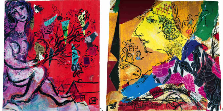 Photos : A gauche Marc Chagall, Esquisse pour Nu mauve, vers 1967. Gouache, encre de Chine, pastel, papiers de couleurs, papiers repeints et tissus collés sur papier, 24,3 x 20,6 cm Collection particulière © ADAGP, Paris, 2018 © Archives Marc et Ida Chagall, Paris. A droite, Marc Chagall, Esquisse pour Le Rappel, 1968-1971 Gouache, encre de Chine, pastel, crayon noir, tissus imprimés, papiers repeints collés sur papier, 16 x 16,2 cm Collection particulière © ADAGP, Paris, 2018 © Archives Marc et Ida Chagall, Paris.