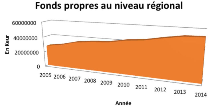 Nous avons relevé les chiffres sur dix années de 2005 à 2014. Et le graphique est limpide : les entreprises de notre région ont augmenté leurs fonds propres passant de 20 milliards d’euros de capitalisation, pour notre panel en 2005, à plus de 45 milliards d’euros, ce qui est tout à fait considérable. Ce mouvement est continu et accuse juste à un tassement avec la crise de 2008-2009.