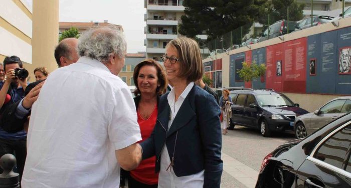 Sur le parvis du théâtre Toursky, au fond de l’impasse Léo Ferré dans le quartier Saint-Mauront, une cinquantaine de personnes attendent, ce vendredi 9 juin, la venue d’une Arlésienne, désormais aussi célèbre que celle de Georges Bizet mais pas pour les mêmes raisons : Françoise Nyssen, ministre de la Culture. Les minutes passent et elles se demandent si c’est bien vrai que la ministre va venir jusqu’ici, parce que, de passage à Marseille, Françoise Nyssen a, comme il se doit, un planning de… ministre. Après une rencontre avec Raymond Vidil au sujet de MP 2018 à la préfecture et avant celle avec les acteurs culturels locaux au Mucem, suivies d’un troisième rendez-vous avec le personnel de la Direction régionale des affaires culturelles (Drac Paca) à Aix-en-Provence, Corinne Versini, candidate aux législatives sur cette 4e circonscription, l’a invitée à venir découvrir ce lieu et surtout son équipe qui œuvre pour la culture à Marseille mais aussi pour ce quartier, « l’un des plus pauvres d’Europe » comme le rappelle Richard Martin. Malheureusement, les finances et la reconnaissance manquent. Alors quand deux berlines noires arrivent, tout le monde retient son souffle. Elle est bien là. Les premiers instants sont même quelque peu maladroits car comment dire tout à coup « Madame La Ministre » à ce visage si familier du paysage culturel de la région.