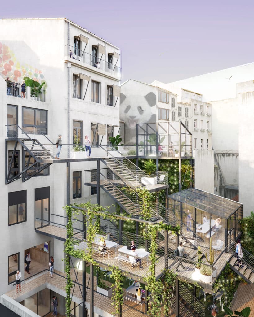Entre les quatre immeubles, l’espace encombré de constructions parasitaires sera dégagé et l’opérateur creusera une salle de spectacle d’une centaine de places pour le hip-hop et le spectacle vivant. Le toit terrasse deviendra un jardin intérieur. « L’îlot se voit restituer un cœur et un sol, végétal, aéré et à l’air libre. Passages couverts, jardin, restaurant, cafétéria associative, salle de musique, studios d’enregistrement, locaux pour ateliers et réunions, et autres bureaux de coworking ou privatisables, composeront ce lieu unique au cœur de la ville phocéenne. L’ensemble retrouvera sa végétalisation et permettra de circuler librement, de faire de l’îlot un lieu vivant, à l’écoute de son environnement et des mouvements du monde, un lieu ressource à l’échelle du quartier et de la ville. »