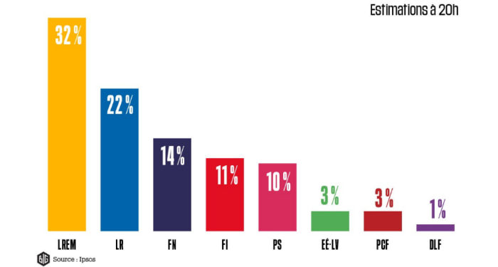 La République en marche est bien partie pour décrocher une très large majorité à l’Assemblée nationale. Le parti d’Emmanuel Macron et son allié du MoDem ont obtenu, dimanche 11 juin, 32,2% des voix au premier tour des élections législatives, selon notre estimation Ipsos/Sopra Steria*. Ce score, proche de la dernière enquête d’opinion, les placent devant l’alliance Les Républicains-UDI (21,5%) et le Front national (14%), au terme d’un premier tour marqué par une forte abstention (50,2% selon notre estimation Ipsos/Sopra Steria*).