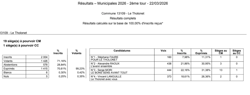 Tous les résultats communiqués lors de la soirée électorale seront provisoires jusqu’à la publication des résultats définitifs, proclamés par les maires sortants de chaque commune précise la préfecture. Au Tholonet le maire sortant Vincent l’anguille n’arrive qu’en 3e position. le nouveau maire est Serge Mori.