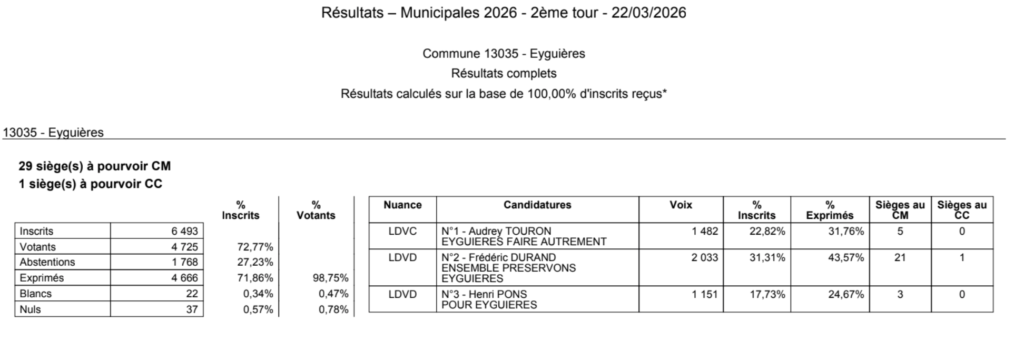 Les premiers résultats provisoires pour le second tour des élections municipales pour les communes des Bouches-du-Rhône viennent d’être diffuser par la préfecture. Il s’agit des communes d’Eyguières, Le Tholonet, Noves.