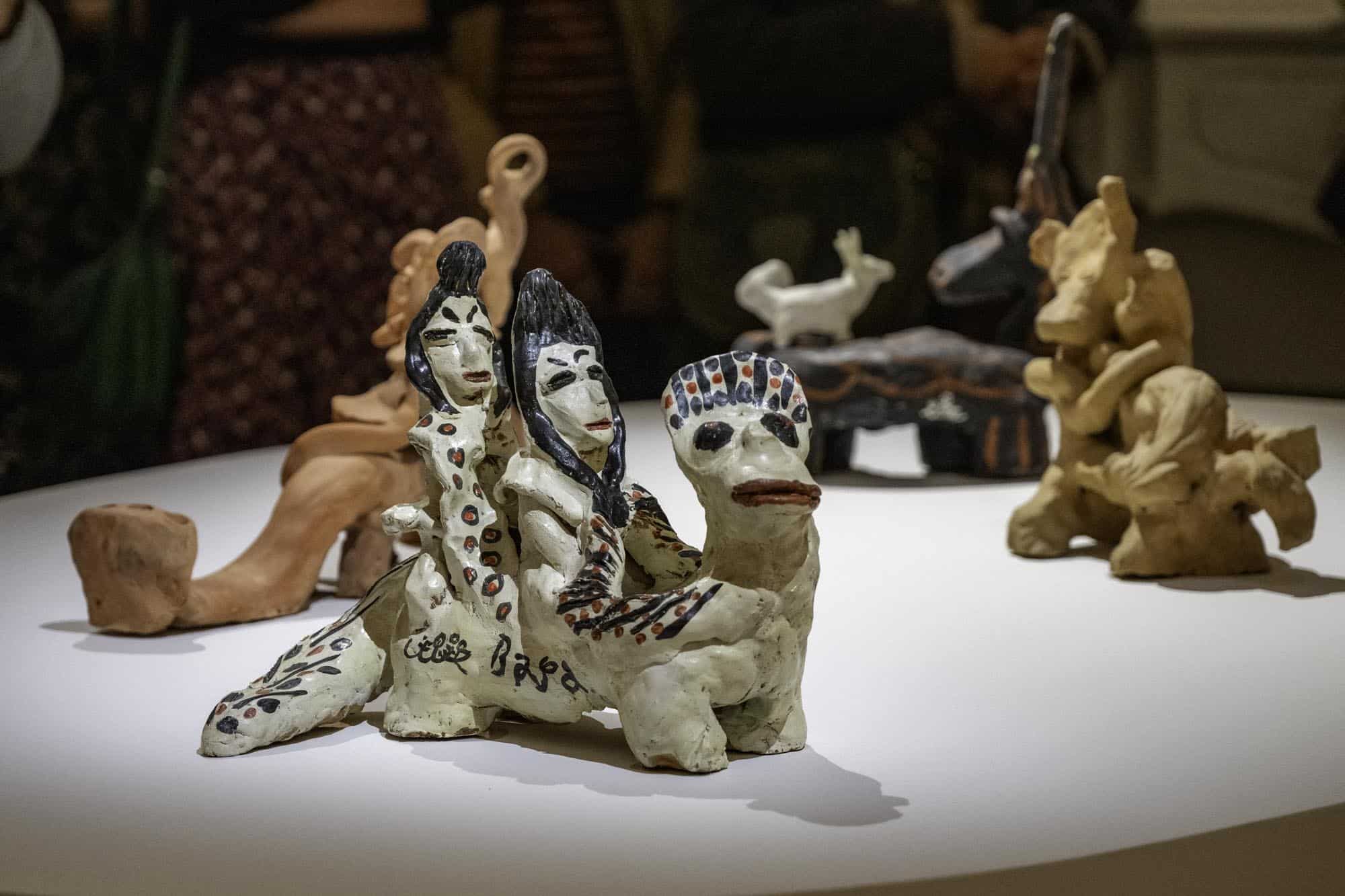 La redécouverte très récente de sculptures fragmentaires en terre cuite polychromée, longtemps pensées disparues, permet de remettre à l’honneur le travail de sculptrice de Baya. Certaines de ces œuvres sont exposées pour la première fois au musée Cantini, au terme d’un travail de restauration qui en a restitué la plénitude des volumes, la lisibilité et la finesse.Leur conservation au sein des musées de Marseille donnera lieu à une étude approfondie du processus de création et de la matérialité de ces sculptures, largement inédites et dont la datation n’est pas toujours connue. » (Extrait de l’exposition Baya à Cantini).