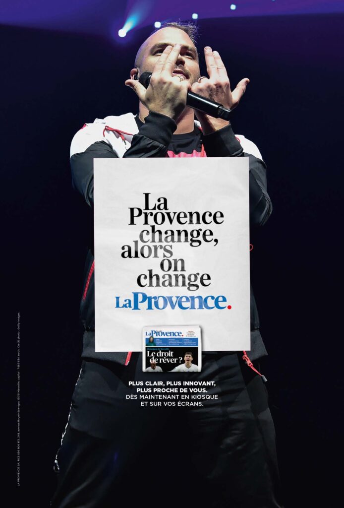 Une campagne de communication La Provence change, alors on change La Provence, réalisée par l’agence Havas Territoires, est axée sur l’importance de s’adapter à son territoire et à son lectorat. Elle comprend de l’affichage. Le chef Alexandre Mazzia et le rappeur Jul sont notamment de la partie en associant leur image.