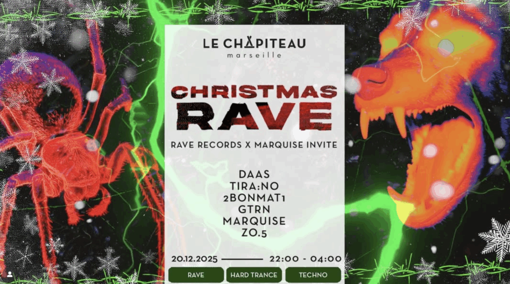 Noël est en ligne de mire, tu l’auras compris et même les plus ultra ne peuvent faire et ne font l’impasse sur l’argument marketing, entre rave, acid, hard bounce, barbes blanches et sapins verts, enguirlandés ou pas. Cette Christmas Rave (ainsi soit-elle) du label lyonnais Rave Records réunit aux commandes : DAAS, Tyrano, 2bonMatin, GTRN, Marquise et Zo.5.