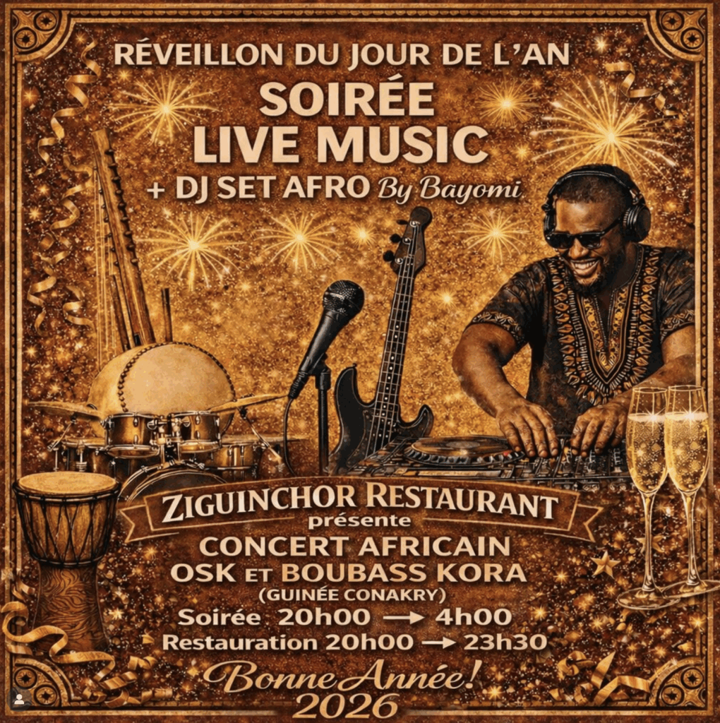 Le restaurant sénégalais de la rue Pastoret convie un trio guinéen composé d’OSK aka le koriste Oumar Kouyaté, Boubass Kora (basse et kora comme l’indique son pseudo) et un percussionniste pour ambiancer son réveillon. Le service de restauration prendra fin à 23h30, le temps de pousser les tables et de danser au son du dombolo, coupé décalé, afrobeat et même reggae, dancehall, reggaeton, rnb, hip-hop mixé par DJ Bayomi.