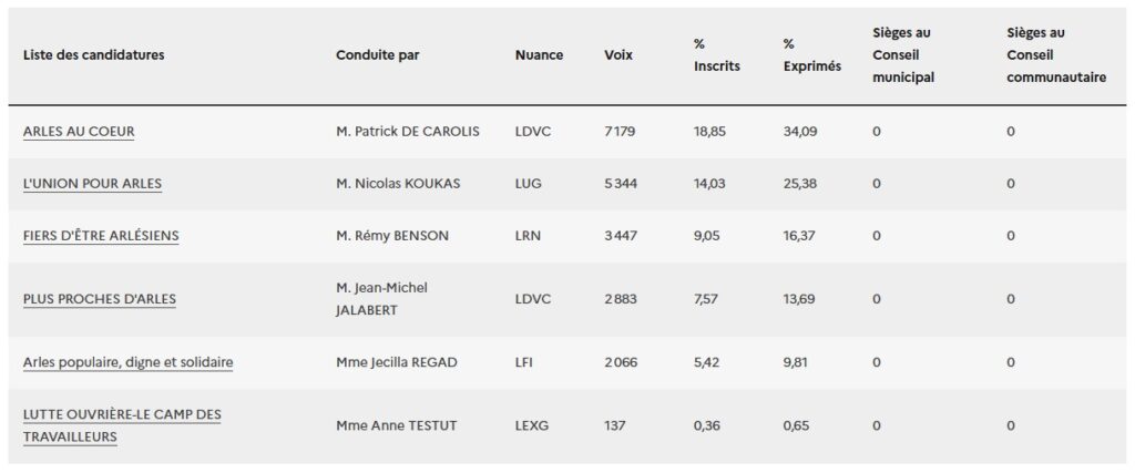 Avec 34,09 % des suffrages, la liste « Arles au coeur » devance la liste d’union de la gauche menée par le communiste Nicolas Koukas et créditée de 25,38 % des voix. Derrière ce duo, deux autres listes dépassent la barre des 10 % qui leur permettent de se maintenir au second tour : la liste du Rassemblement national conduite par Rémy Benson recueille 16,37 %, tandis que Jean-Michel Jalabert (DVD) obtient 13,69 % et se pose en arbitre du second tour. Ancien premier adjoint de Patrick de Carolis, ce dernier detient désormais une grande partie de l’issue de l’élection, selon qu’il se maintienne ou non. Le maire sortant n’a d’ailleurs pas tardé à lui tendre la main.