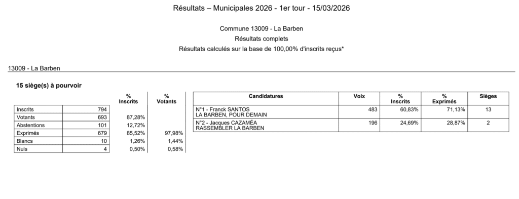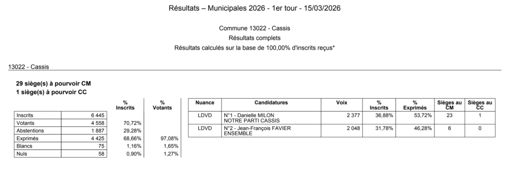 Le ministère de l’Intérieur publie de nouveaux résultats à 20h20 de plus sieurs communes des Bouches-du-Rhône : Cassis, Cuges-les-Pins, Eyguières, Gémenos, Graveson, La Barben, Lamanon, Peypin, Vauvenargues, Verquières.