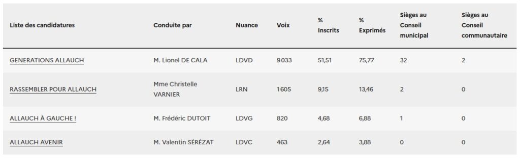 Avec près des trois-quarts des voix, Lionel de Cala distance très nettement ses adversaires. Sa liste obtient 32 sièges sur les 35 que compte le conseil municipal, s’assurant une majorité très confortable pour le prochain mandat. Cette victoire traduit une continuité politique dans la gestion municipale d’Allauch. Le score enregistré lors de ce scrutin confirme le soutien massif d’une grande partie des électeurs à la ligne portée par le maire sortant. Le successeur de Roland Povinelli a su se faire apprécier des Allaudiens pendant son premier mandat.