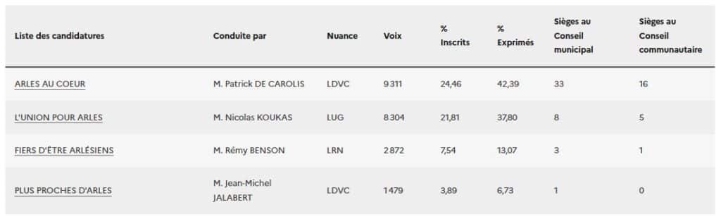 Engagé dans une quadrangulaire incertaine, le maire sortant Patrick de Carolis (DVD) retrouve son siège après avoir recueilli 42,39 % au second tour. Il devance la liste d’union de la gauche menée par le communiste Nicolas Koukas, créditée de 37,8 % des voix et qui touche en quelque sorte son plafond de verre malgré un bon report de voix de la liste LFI éliminée de justesse au 1er tour (9,81 %).