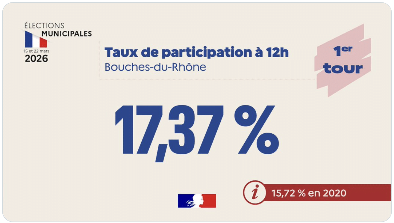 Le taux de participation estimatif pour les élections municipales de 2026 se situe à 12h dans les Bouches-du-Rhône à 17,37% annonce la Préfecture. En 2020, un scrutin marqué par le Covid, à la même heure, le taux de participation était de 15,72%.