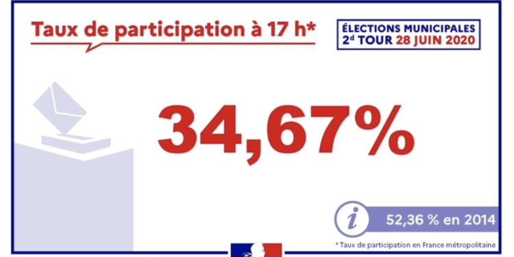 L’abstention s’annonce record pour le second tour des municipales. Au niveau national, le taux de participation n’atteint que 34,67% à 17h soit une heure avant la fermeture des bureaux de vote (hors métropole). C’est une baisse de quatre points par rapport au 1er tour qui avait été déjà très en tretarit des précédents scrutins. La baisse de participation est de 18% par rapport aux élections municipales de 2014, de 20% par rapport à 2008.