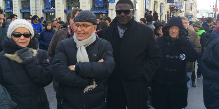 (Illustration : Pape Diouf et Philippe San Marco, dimanche 11 janvier 2015 sur la Canebière dans le défilé pour dire non à la barbarie après les attentats de Charlie Hebdo. Crédit © JFE)