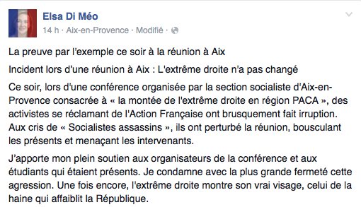 Contactée par Gomet’, Elsa Di Méo, conseillère régionale (PS) en Paca qui participait à la conférence en tant qu’invitée nous a confié qu’une plainte allait être déposée. Elle déclare sur son compte Facebook que les intervenants ont été menacés.