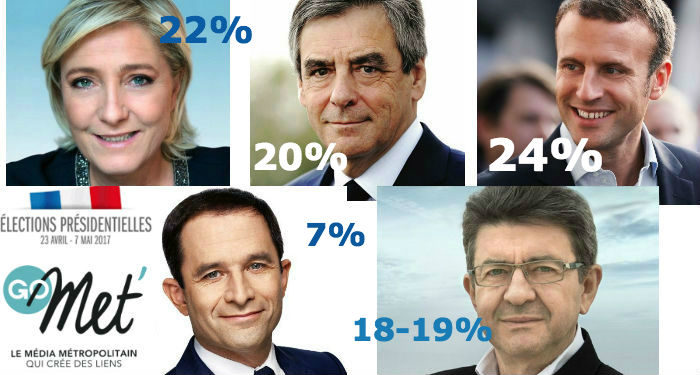 À 20h, l’estimation du Cevipof confirme et amplifie même le phénomène avec un score estimé de 24% pour Emmanuel Macron, 22% des voix pour Marine Le Pen, 20% à François Fillon et entre 18 et 19% pour Jean-Luc Mélenchon (France insoumise).