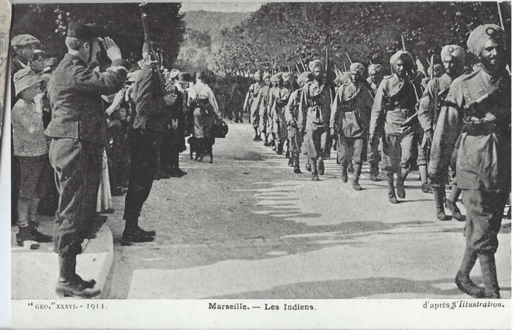 Le rôle de ces soldats a été notamment très important dans les combats qui se sont déroulés dans les départements du Nord et du Pas-de-Calais. Le corps d’armée indien débarque en France le 26 septembre 1914 à Marseille et séjourne au parc Borély, sur l’Hippodrome, à la Valentine et à la Barasse… avant d’être acheminé en train jusqu’à Saint-Omer, où il arrive le 26 octobre.