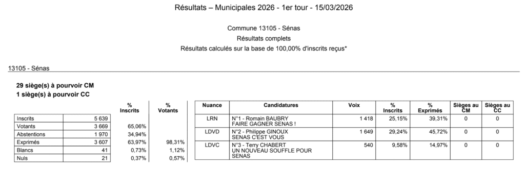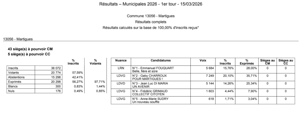 Les résultats provisoires pour le 1er tour des élections municipales pour les communes des Bouches-du-Rhône suivantes : Eyragues, La Fare-les-Oliviers, La Penne-sur-Huveaune, La Roque d’Anthéron, Martigues, Meyrargues, Roquefort-la-Bédoule, Saint-Marc-Jaumegarde, Saint-Savournin, Sénas.