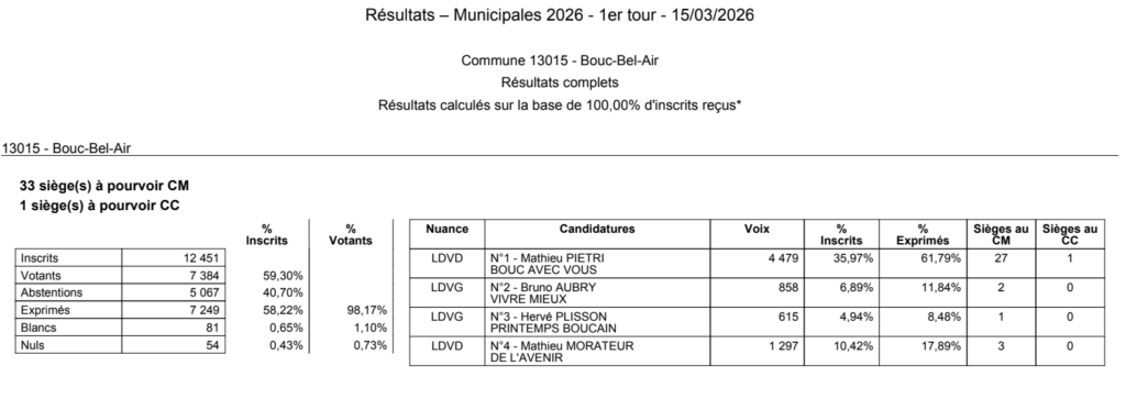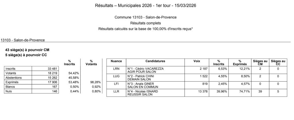 Nouveaux résultats du 1er tour communiqués par la préfecture pour les communes de la Barbentane, Bouc-Bel-Air, Carnoux-en-Provence, Ceyreste, Maillane, Orgon, Saint-Cannat, Saint-Chamas, Saint Paul-les-Durance et Salon-de-Provence.