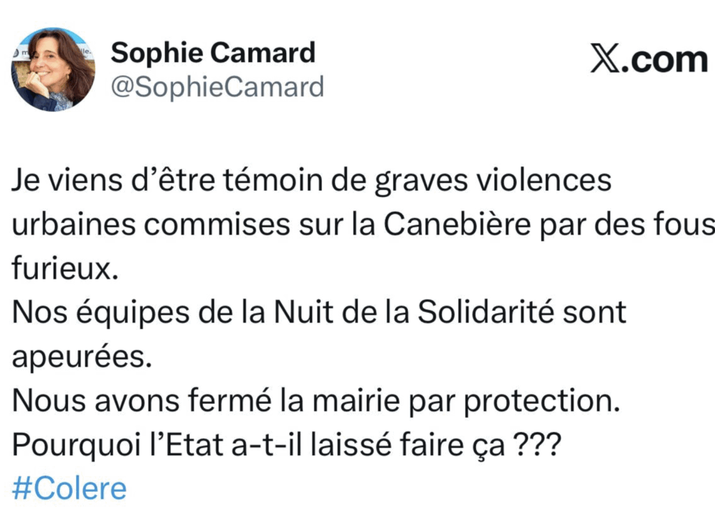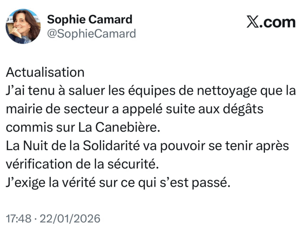 La maire de secteur (1er 7e arrondissements), Sophie Camard (Printemps Marseillais), s’est également exprimée dans deux tweets successifs qui ciblent les autorités et demandent des explications.
