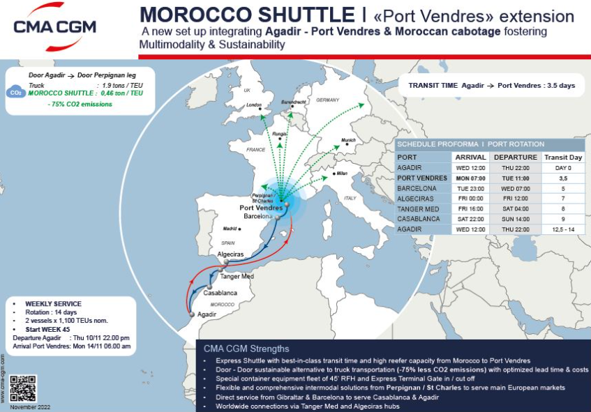 L’armateur marseillais CMA CGM annonce dans un communiqué le lancement d’un nouveau service hebdomadaire – le « Butterfly Marocco Shuttle » – reliant le Maroc, la France et l’Espagne, à compter du 10 novembre prochain. Il vise à mettre en place un pont maritime entre Agadir et Port Vendres pour la prochaine campagne d’exportation de fruits et légumes. Le groupe présidé par Rodolphe Saadé promet une réduction de 75% des émissions de CO² par rapport à l’acheminement traditionnel par camion via ce corridor. Deux navires sous pavillon marocain de 1100 EVP seront exploités.