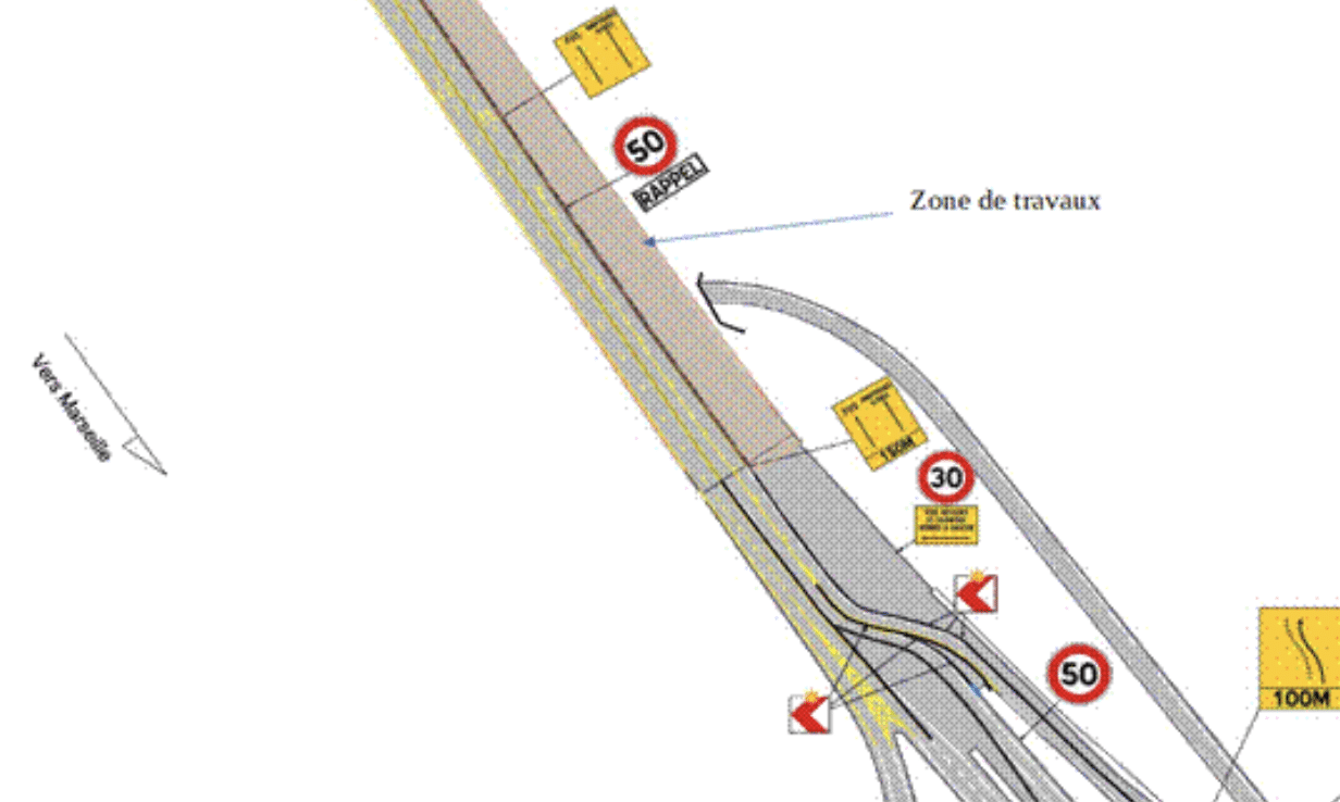• une information sur la déviation sera réalisée en amont sur les panneaux à messages variables (PMV) : au sud sur l’A7 et l’A55 et au nord sur la RN113, l’A54 et l’A7 ;